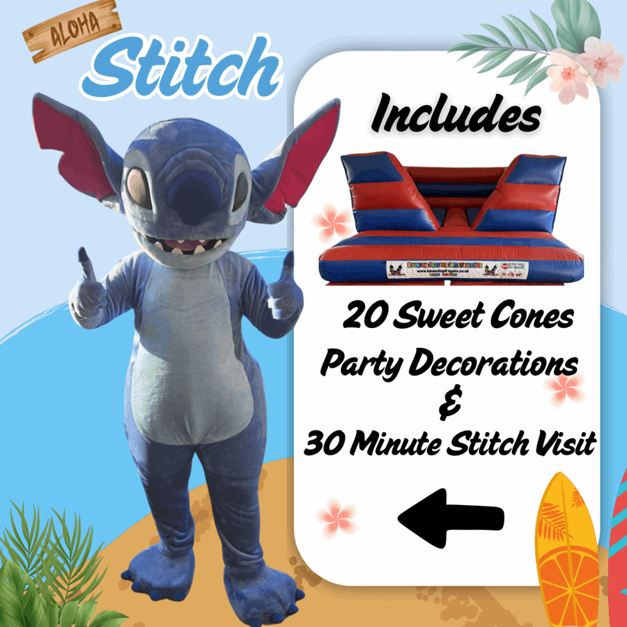 Birthday parties for Stitch and Disney fans who love bouncing fun! This all-inclusive package delivers bouncy castle excitement, a real character visit from Stitch, stunning themed decorations, and sweet treats for guests. Ideal for children aged 3-10 who love Lilo & Stitch adventures and active play. Suitable for indoor venues and outdoor celebrations (outdoor May-September).