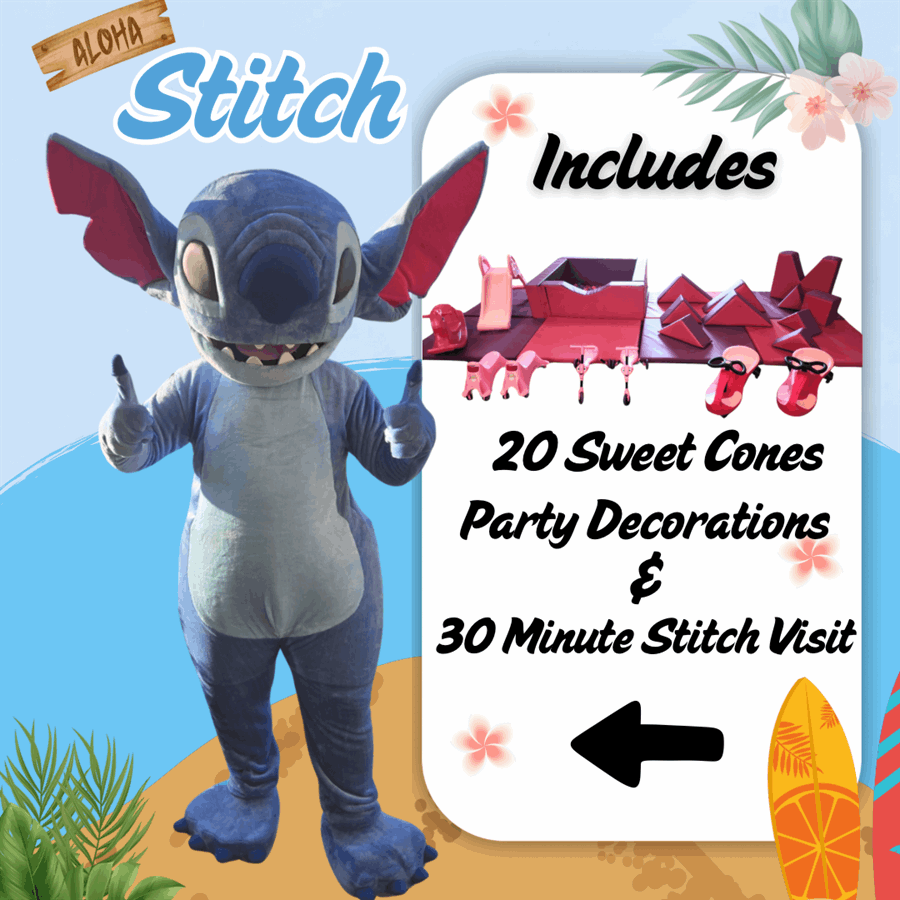 Ohana means family, and this party is perfect for your littlest family members! This all-inclusive package combines safe soft play fun with a character visit from Stitch himself, themed decorations, and sweet treats – perfect for young Stitch fans who love adventures!